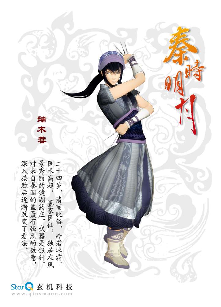 墨家统领之一,出身医家。清丽脱俗,冷若冰霜,实则外冷内热、似刚却柔,居住在风景秀丽的镜湖医庄,年纪轻轻却医术高明,有“镜湖医仙”之称。与燕国高月公主同为墨家弟子,对高月百般呵护。对来自秦国的“剑圣”盖聂有强烈的敌意,但深入接触后逐渐改变了看法,互生爱慕之情。