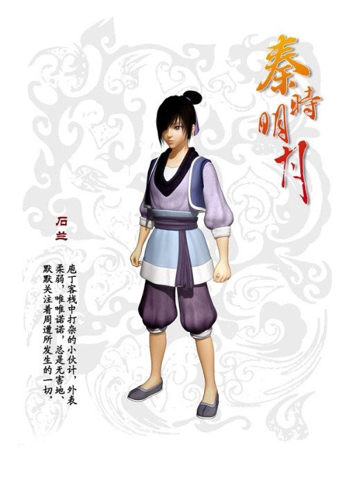 神秘莫测的少女,来自西方蜀国。表面上是庖丁客栈中打杂的小伙计,外表柔弱,沉默寡言,默默地关注着周遭所发生的一切。真实身份是蜀山的虞渊护卫之一,如精灵一般身轻如燕,身手矫捷。有一双冰冷的眼眸,内心有很强的正义感和民族信仰。