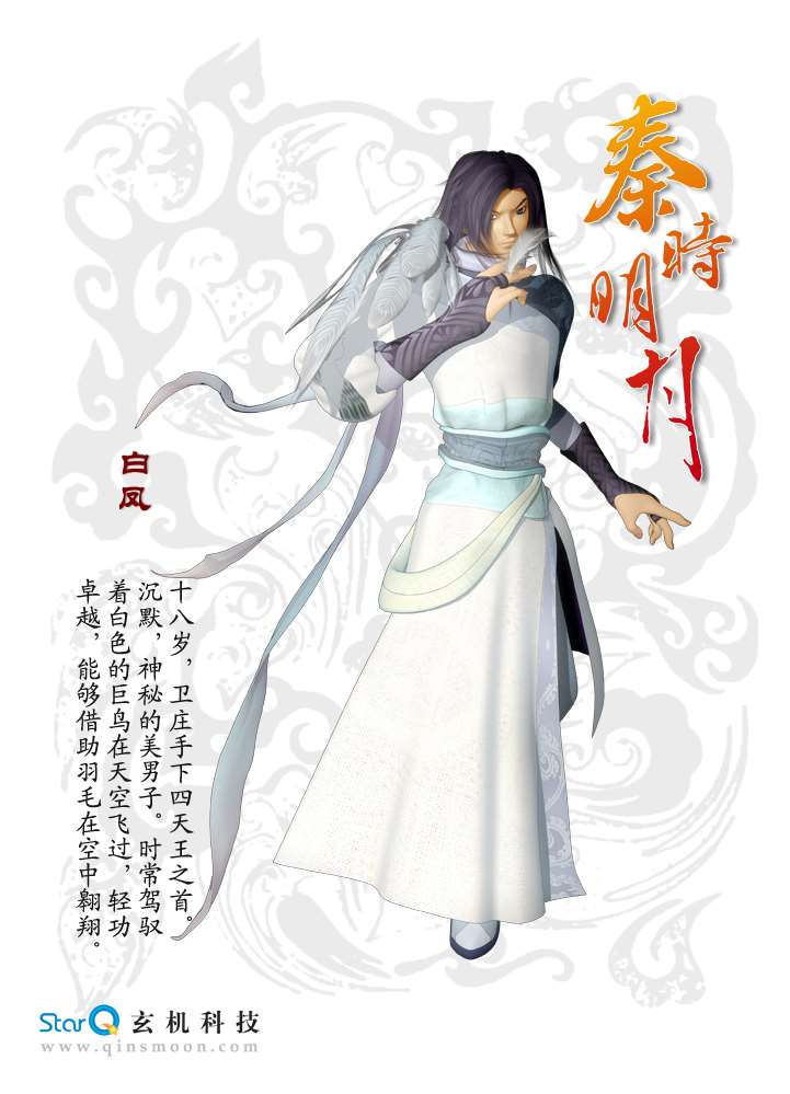 神秘优雅的白衣美男子,轻功举世无双,能够借助鸟类或羽毛飞翔,时常驾驭着白色的巨鸟在天空飞过。天赋异禀,具有控制与指挥鸟类的能力,被称为“百鸟之王”。