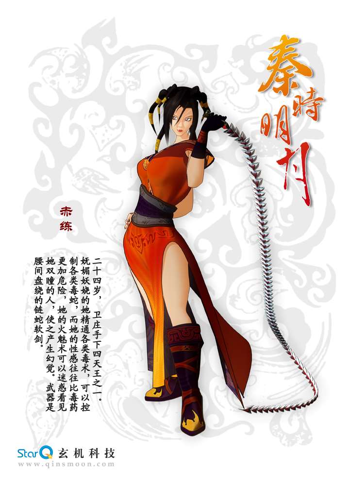 原为韩国公主,封号“红莲”。后成为“聚散流沙”四天王之一。妩媚妖娆,精通各类毒术,善于控制各类毒蛇,而她的性感往往比毒药更加危险。她的火魅术可以迷惑看见她双瞳的人,使之产生幻觉。